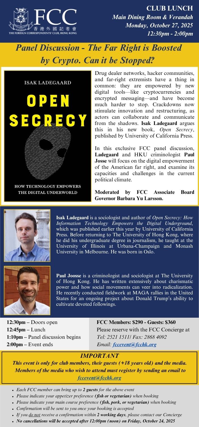 To learn more and RSVP, please visit https://www.fcchk.org/event/club-lunch-panel-discussion-the-far-right-is-boosted-by-crypto-can-it-be-stopped/.