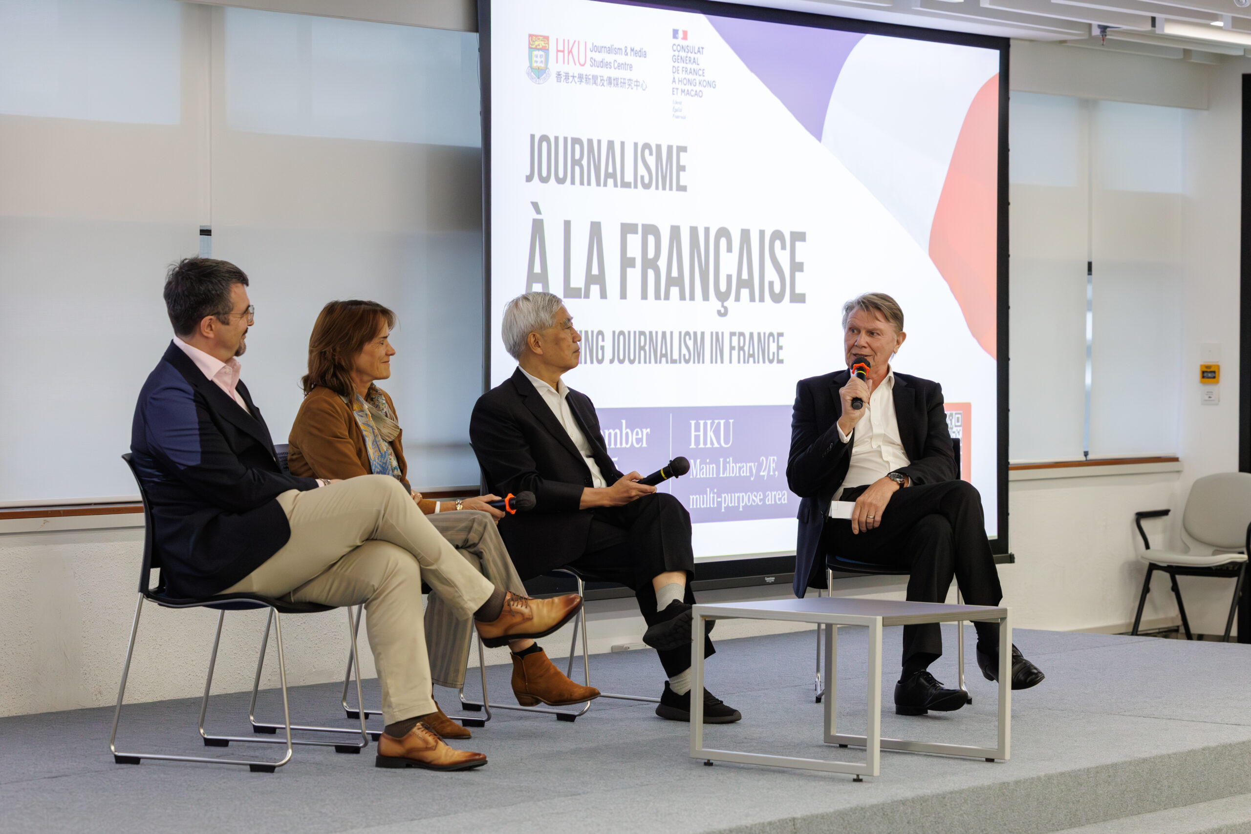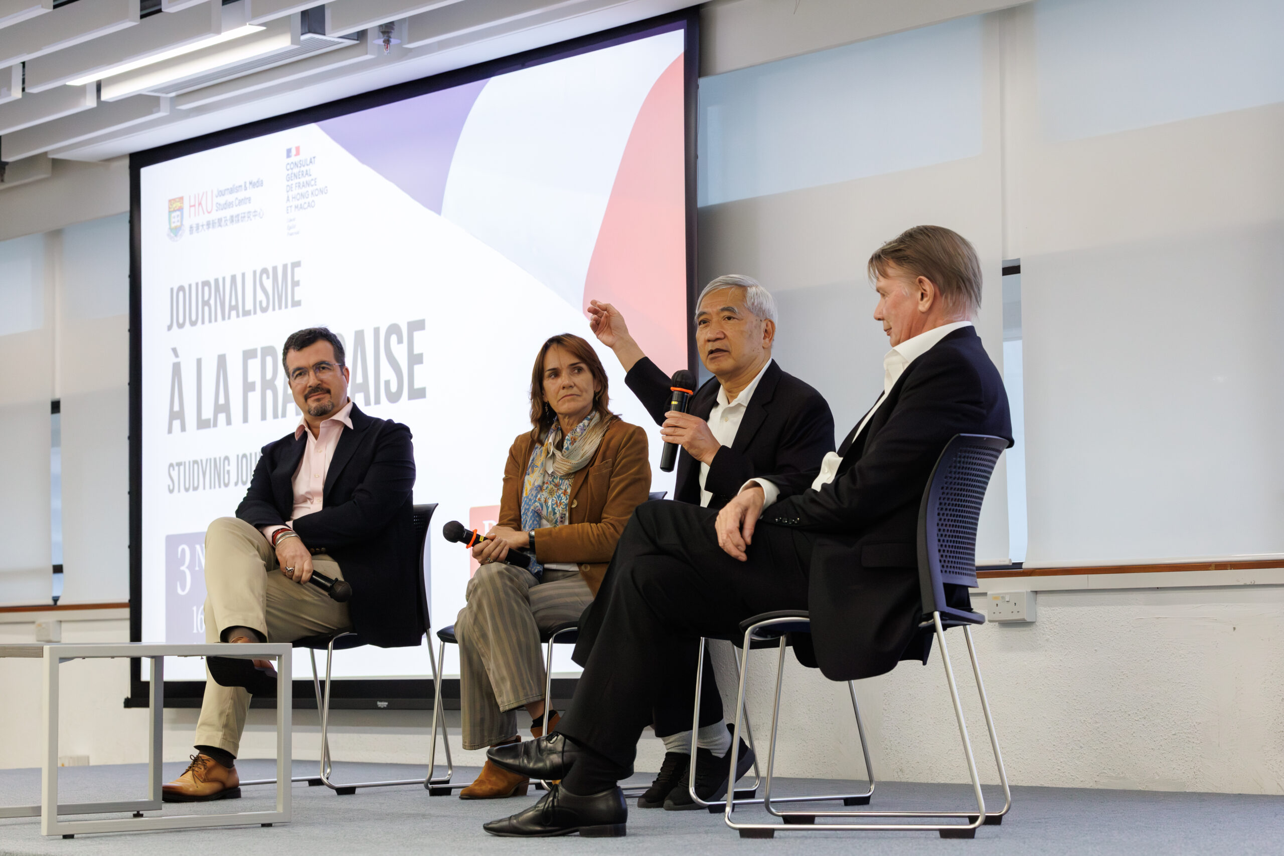 Honorary lecturer and AFP standards and ethics editor Eric Wishart, Veteran journalist and founder of the HK Economic Times Perry Mak, foreign correspondent Florence de Changy, and freelance journalist and lecturer Eric Sautedé led the first panel, sharing what the "French touch" of journalism is.