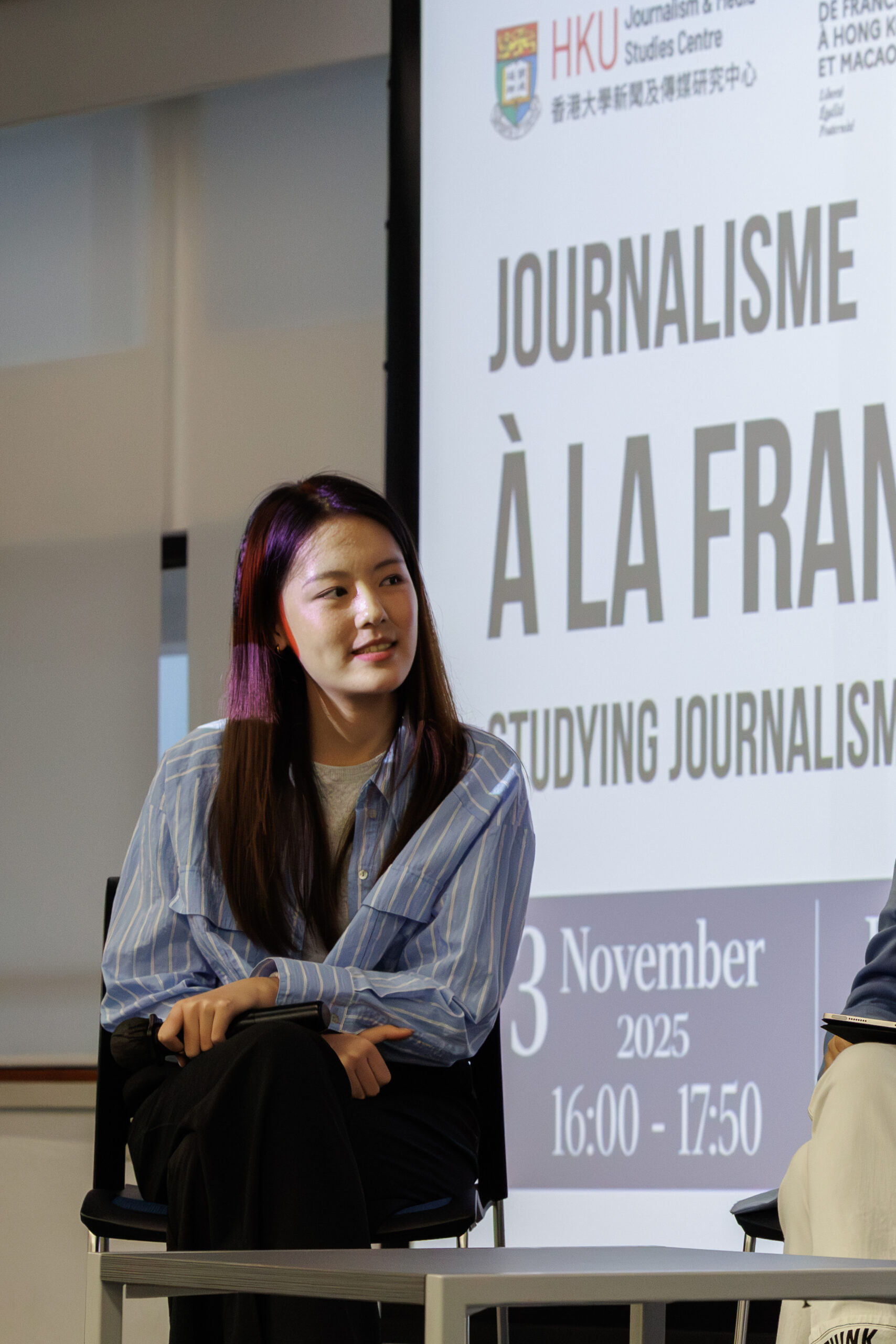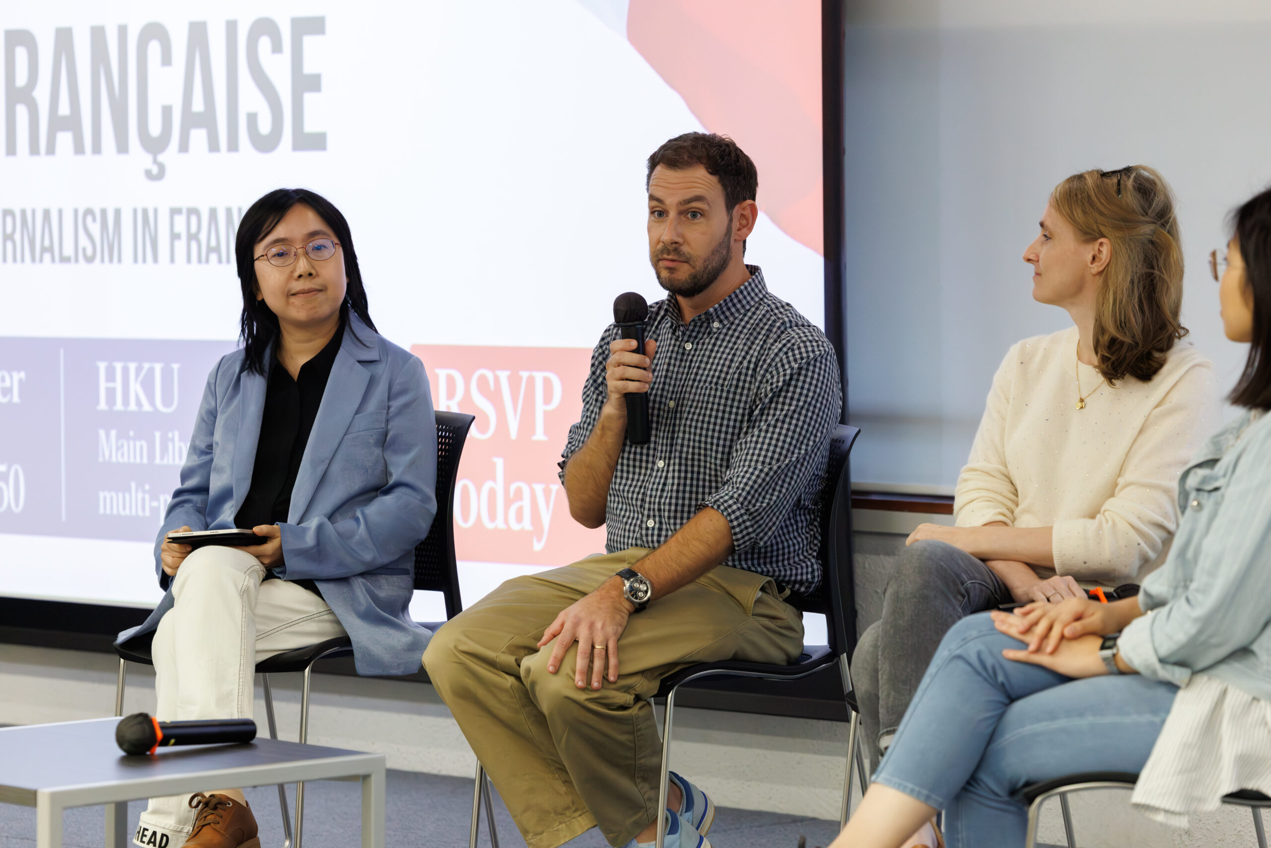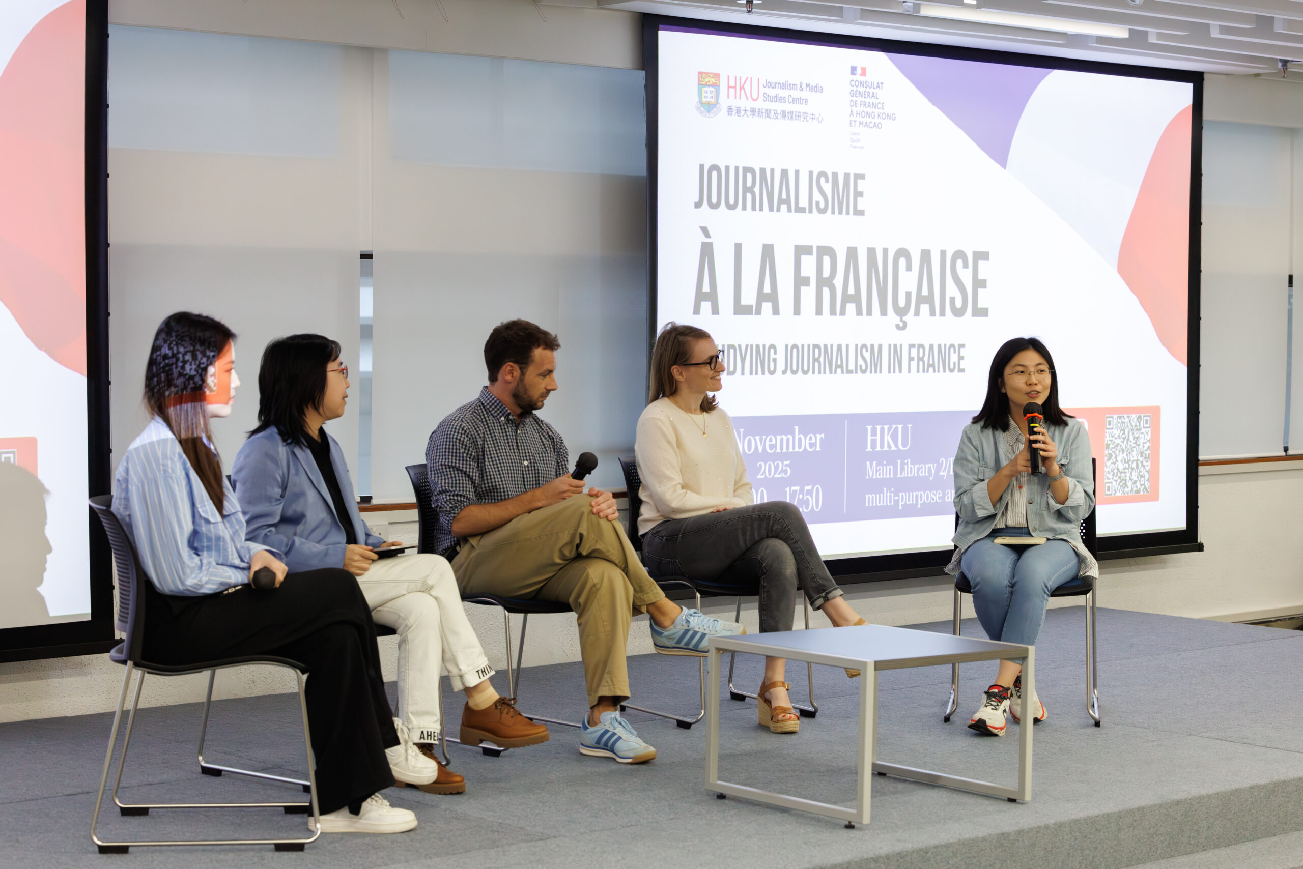 HKUST Professor Celine Song, AFP journalist Germain Moyon, France TV Grand Journalist Anne Claire Poignard, and JMSC BJ student Christina Meng discussed their experiences studying and practising journalism in France. JMSC alumnus Vicky Kung (BJ 2012) moderated the session.