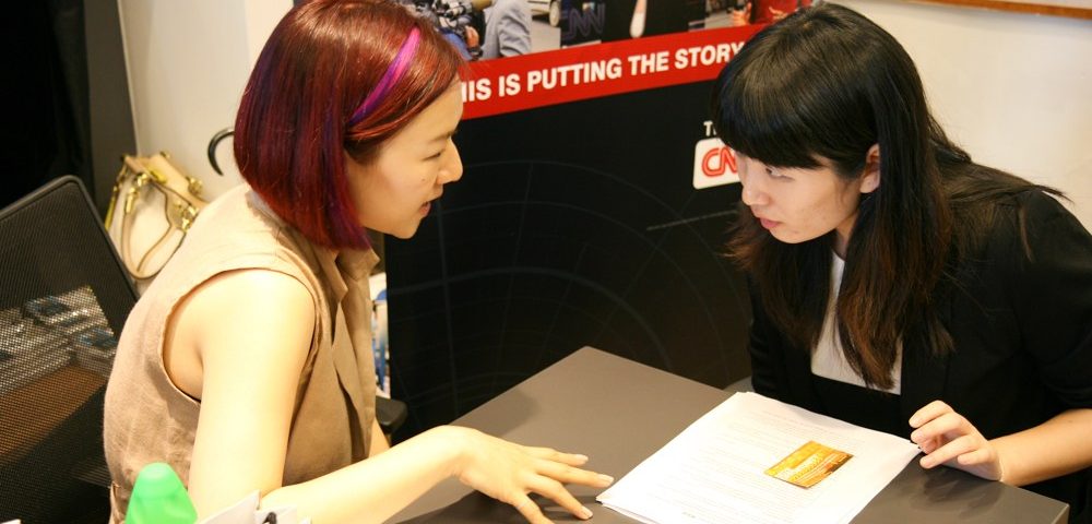 A student has reviews her resume with Phoebe Cheung (right), Human Resources Officer for the Asia Pacific at CNN International.