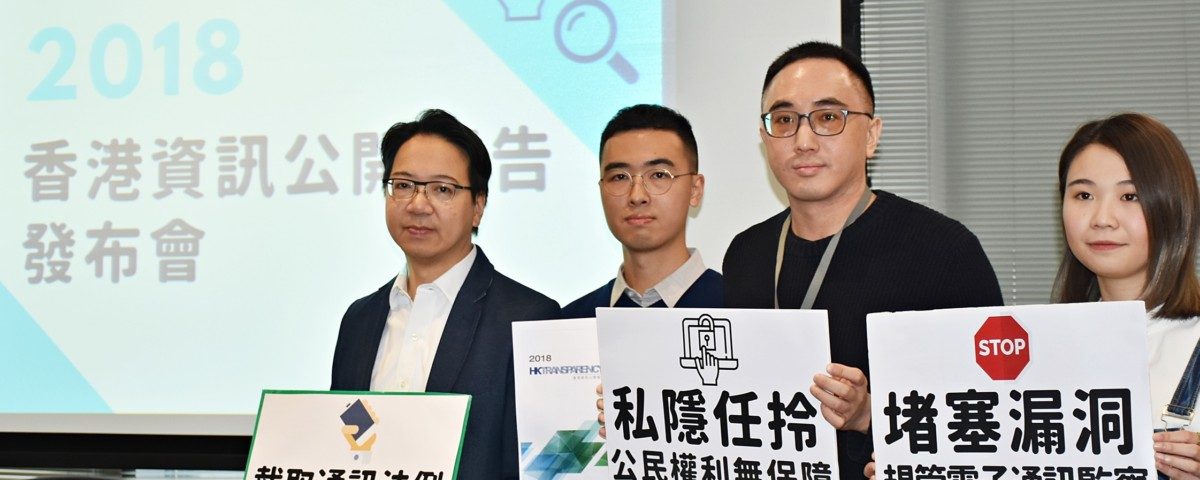 The HK Transparency Report published the findings of its survey of cyberspace surveillance in five jurisdictions on 9 February. The research seeks to shed light on solutions for Hong Kong to improve the current surveillance law and calls for the government to issue guidance to law enforcement agencies in accessing user data. Read the full report here. Project manager Benjamin Zhou (second from left) announced the findings at a press conference with Hong Kong legislative councillor Charles Mok (first from left) on 9 February.