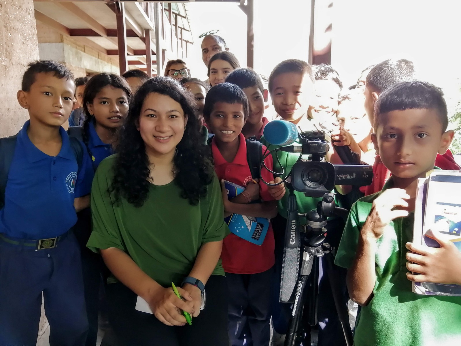 Paavan with some pupils after reporting about their school in western Nepal in 2019
