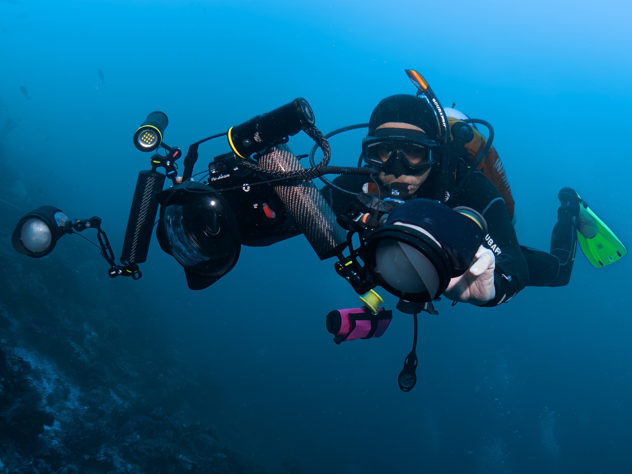 Samson diving with his photography gear at Raja Ampat, Indonesia, in January 2024