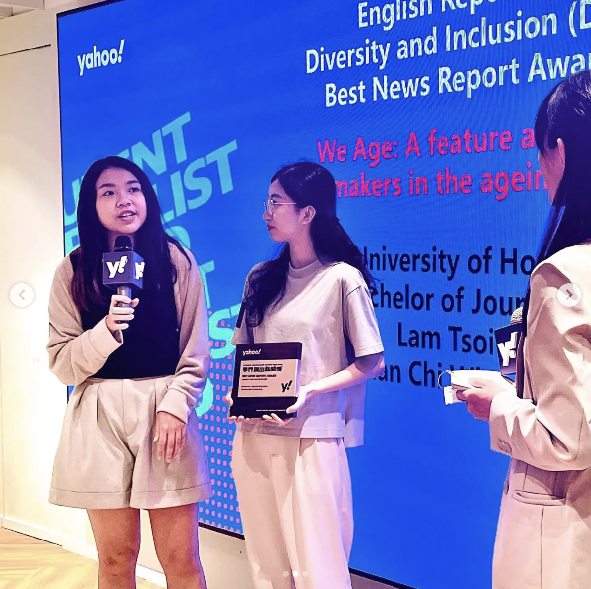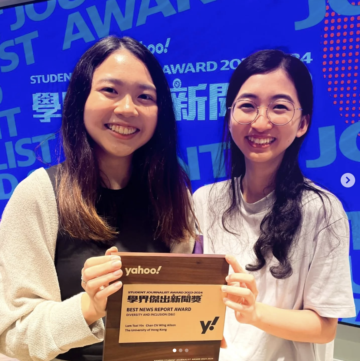 Congratulations to Alison Chan and Prudence Lam (BJs 2024) for winning the Best News Report award in the Diversity and Inclusion category from the Yahoo! Student Journalist Award 2023-2024.