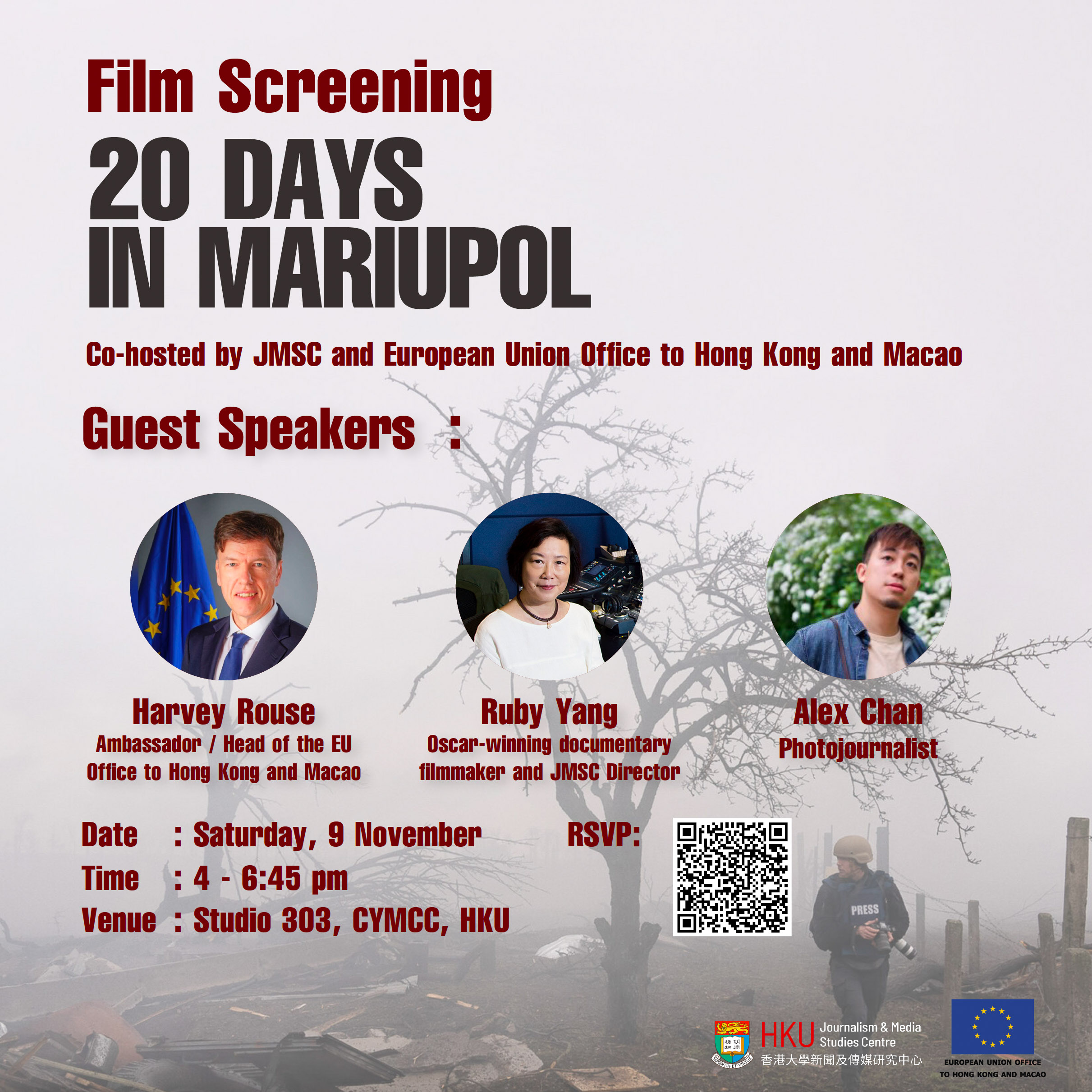 HKU Journalism and Media Studies Centre is co-hosting a screening of the winner of the 2023 Academy Award for Best Documentary Feature Film — 20 Days in Mariupol, with the EU Office to Hong Kong and Macao on 9 November, 2024.