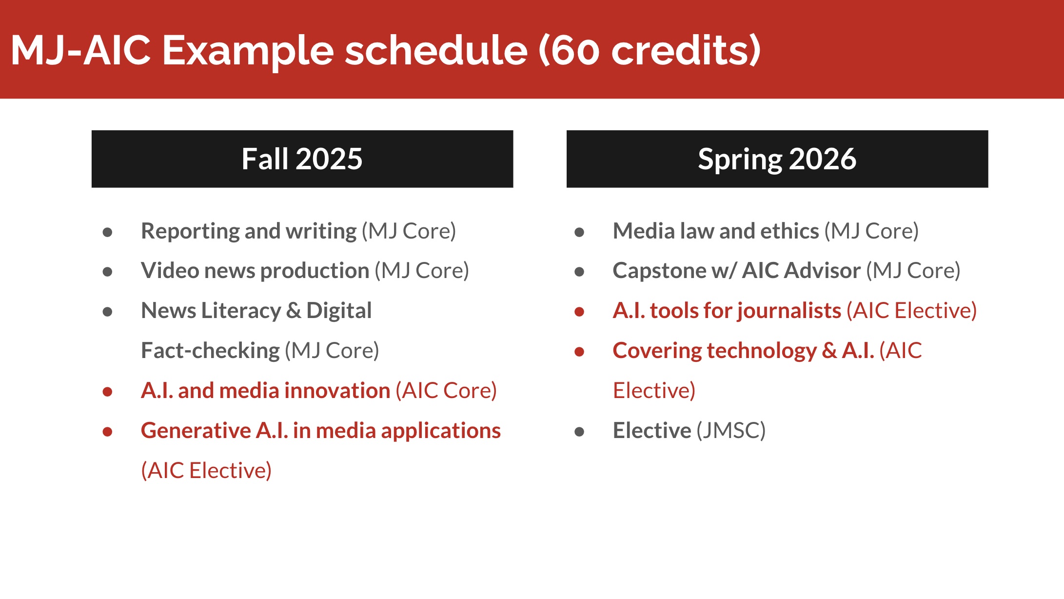 *MJ-AIC is part of the Master of Journalism curriculum. Students may declare the A.I. and Innovation concentration upon accepting the 25-26 admission offer.