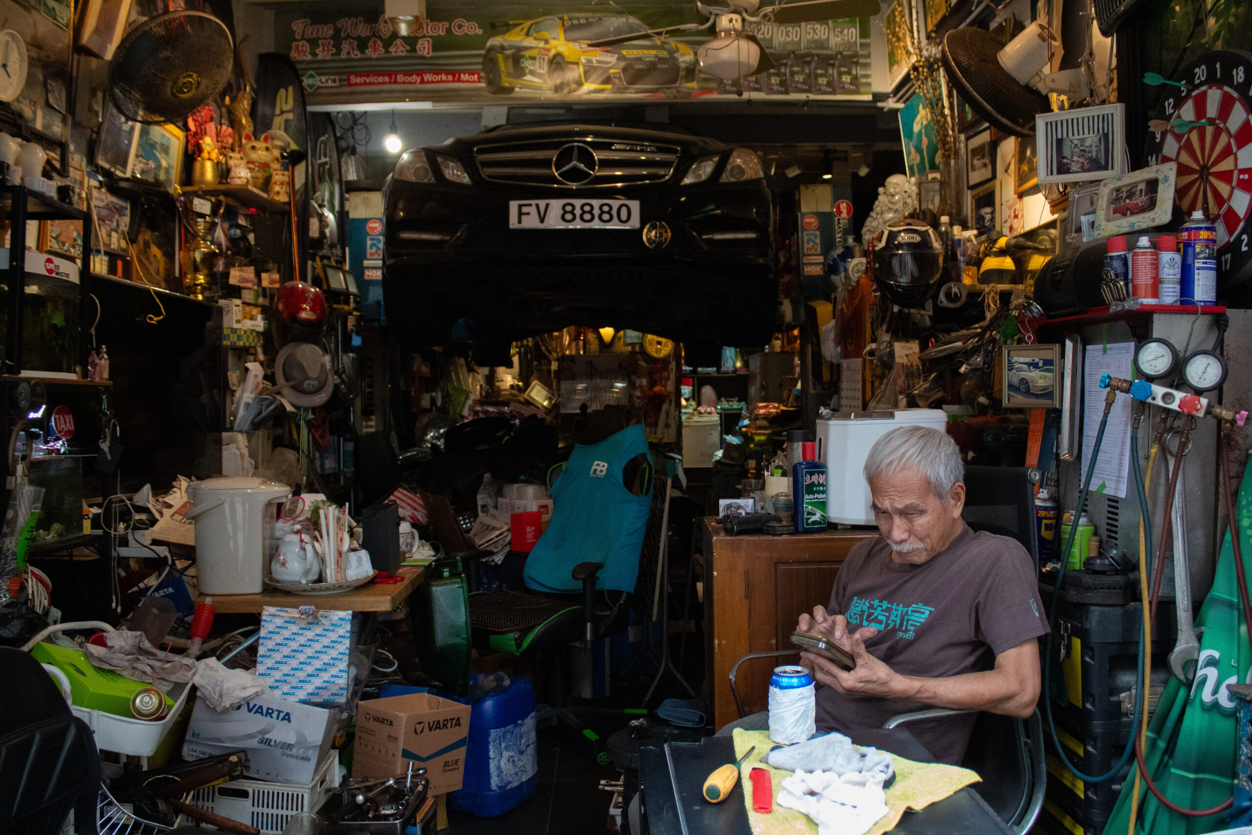 A man watches over his nephew’s cluttered shop in Hong Kong’s Sai Ying Pun neighborhood on 5 November 2024. The store was packed floor-to-ceiling with assorted goods.. Photo: Chloé Auffray (exchange student)