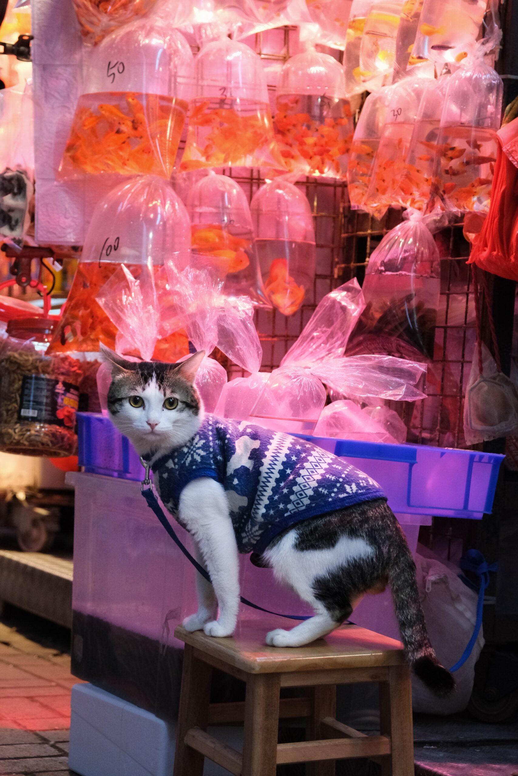 A cat stands on a stool at the entrance of a goldfish store in Tung Choi Street, also known as the Goldfish Market in Mong Kok (20 February 2025). Photo: Denise Tang Ramos (BJ 2025)